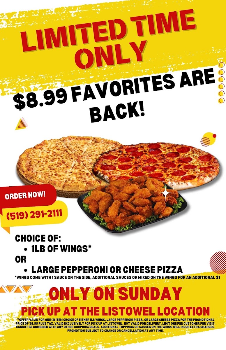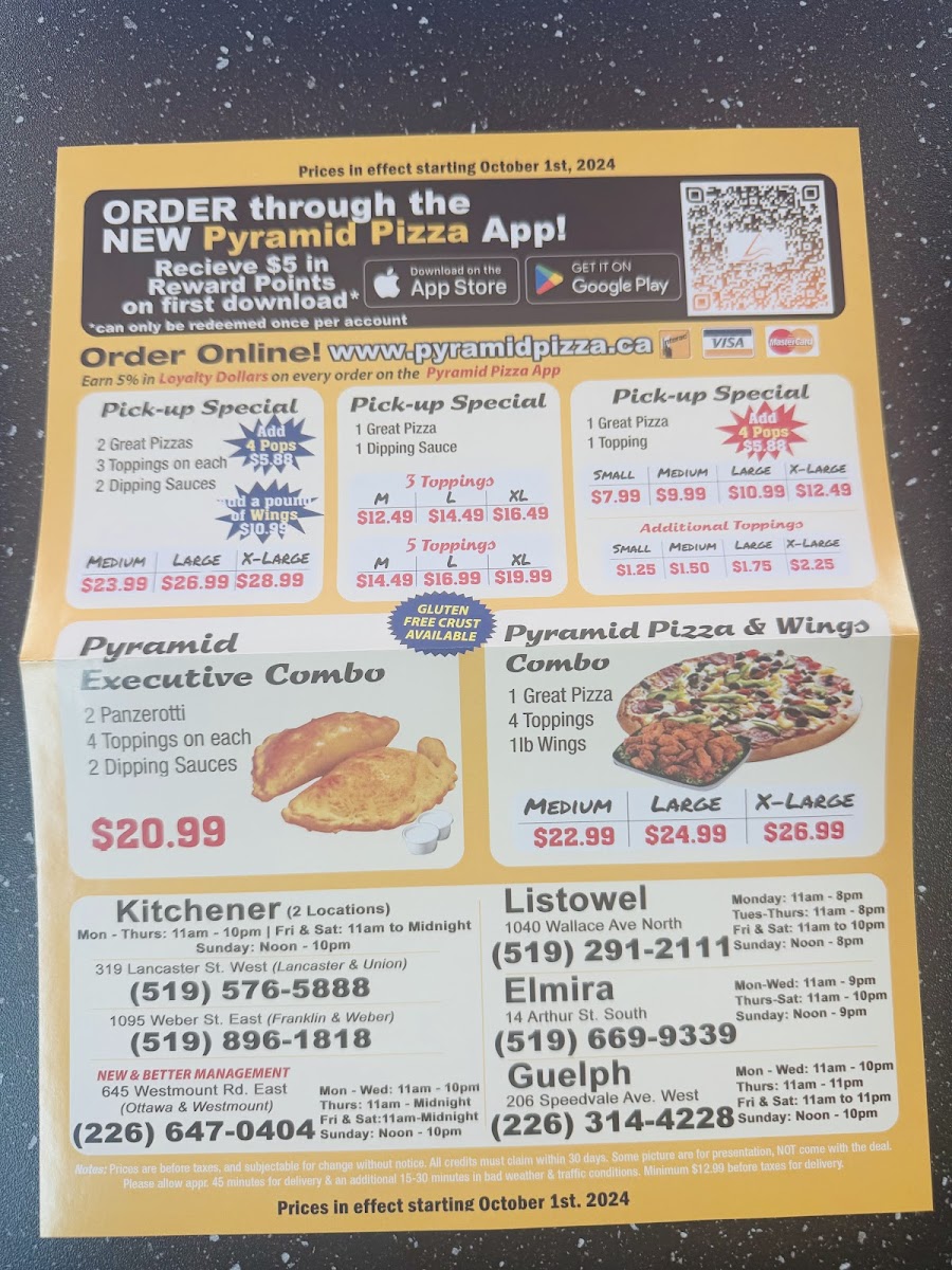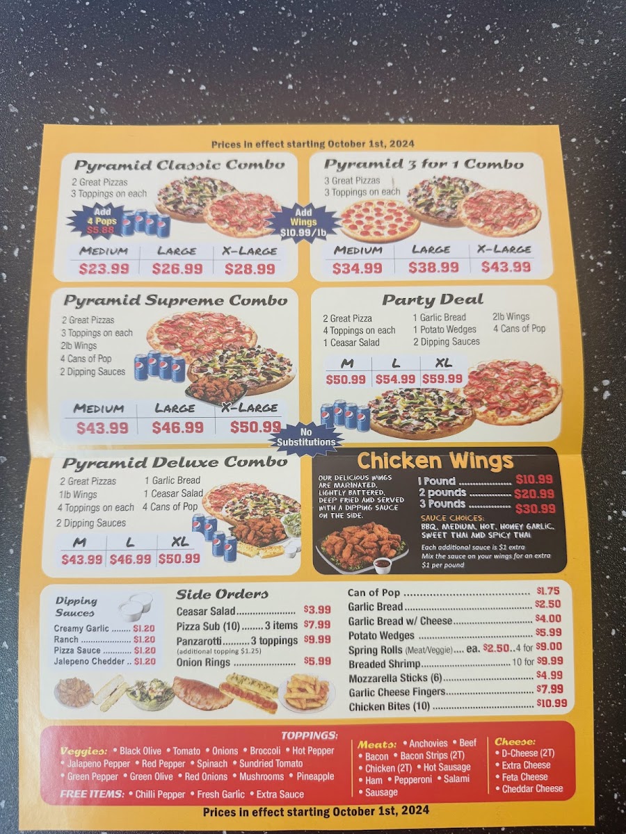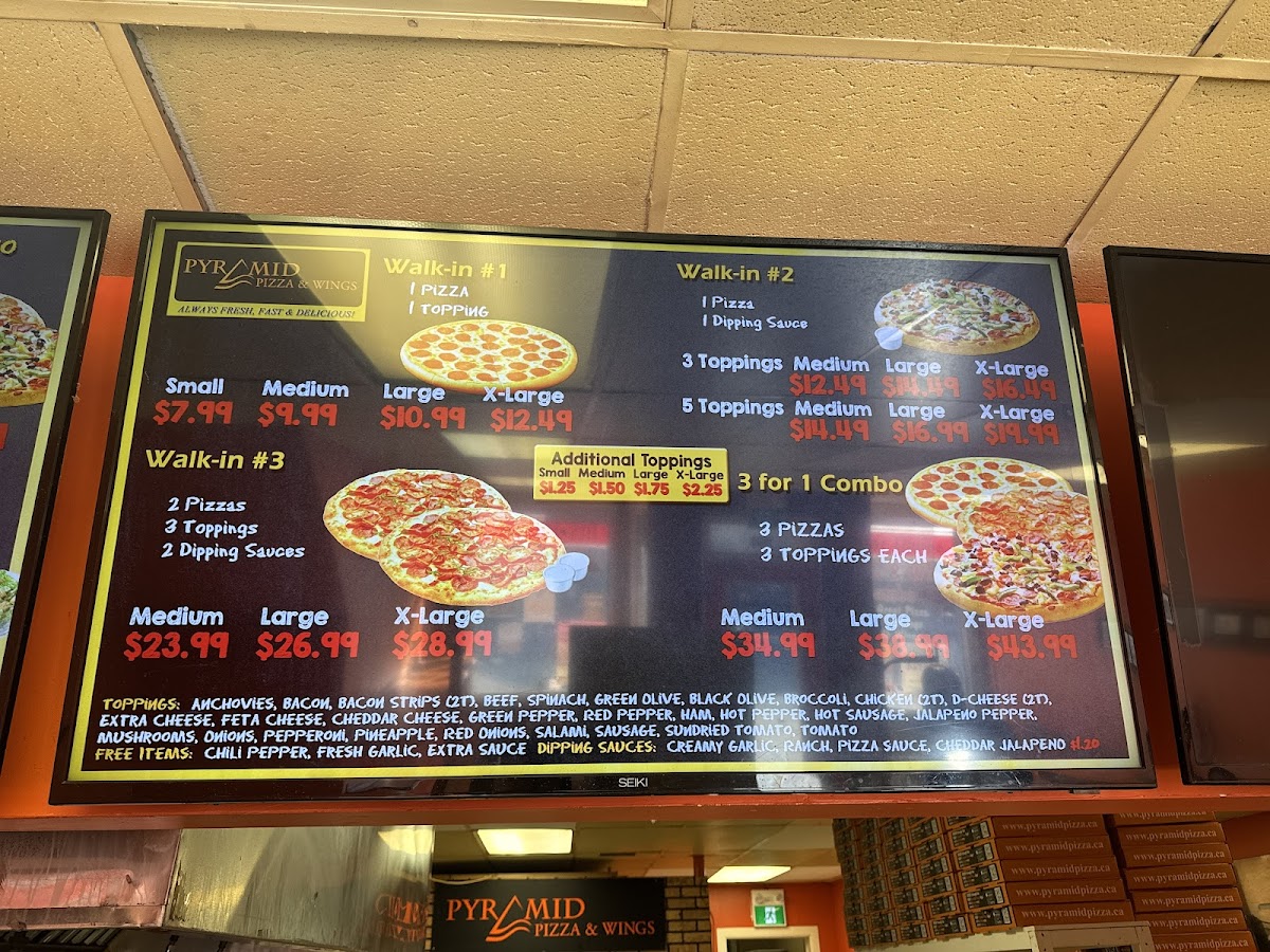 Pyramid Pizza & Wings in Listowel, ON, is a go-to spot for pizza lovers seeking quality and flavor. Their menu offers a delightful range of classic pizzas with generously layered toppings and a perfectly balanced crust—neither too thick nor too thin—making each bite satisfying. Complementing the pizzas are their standout wings, praised for being massive, juicy, and lightly crispy, with minimal grease, offering a clean yet flavorful experience. Beyond the main dishes, the menu includes a variety of well-crafted sides such as crispy onion rings, golden potato wedges, mozzarella sticks, garlic bread with or without cheese, and unique items like panzarotti and breaded shrimp, providing ample choices to enhance your meal. Customers appreciate the fair pricing and swift service, making it an ideal spot for quick pick-ups or casual dining. The arcade on-site adds a fun, nostalgic twist to the dining experience. Pyramid Pizza & Wings truly captures the essence of comfort food with a touch of heartwarming service.